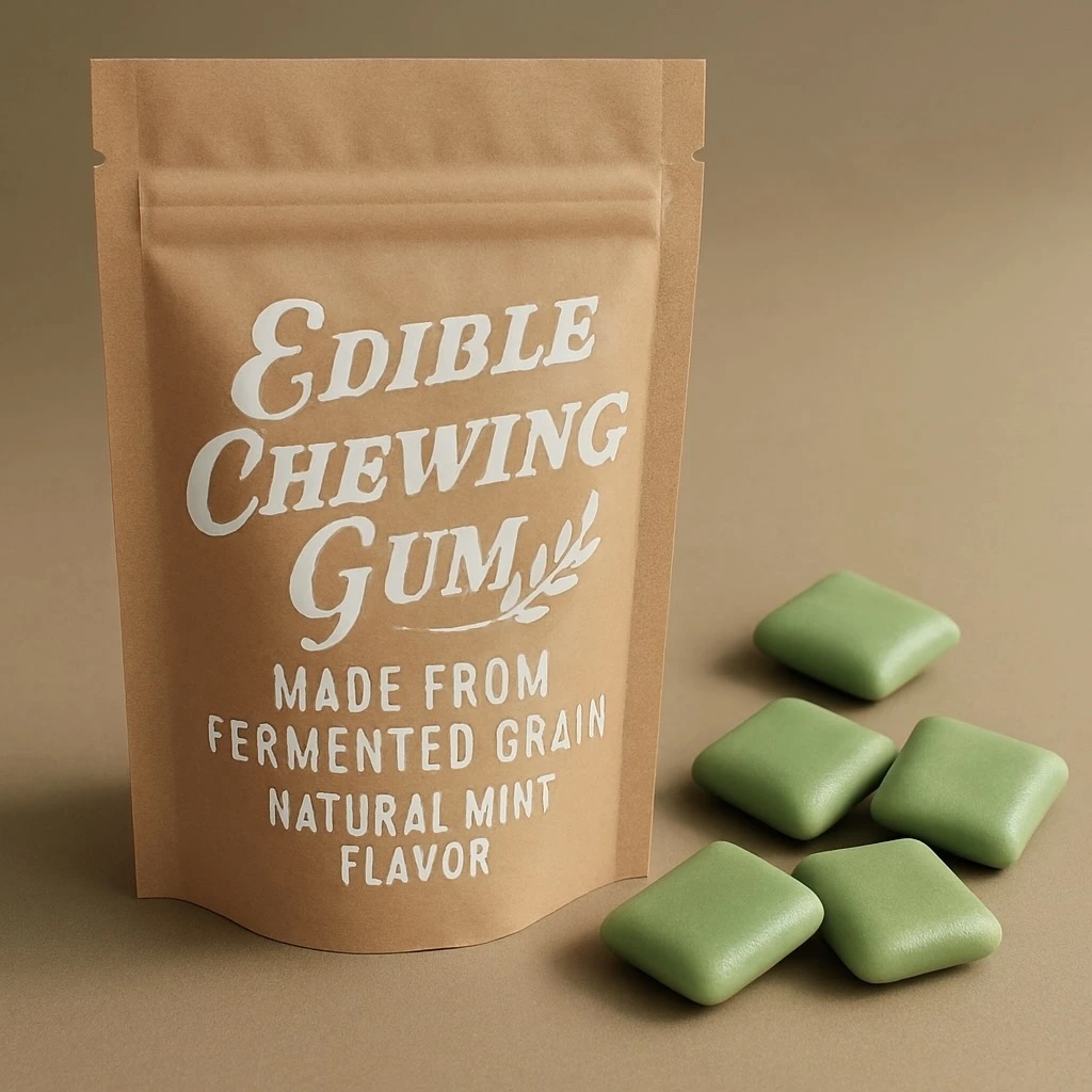 The method enables the conversion of selected grain materials into an elastic, chewable matrix suitable for oral use. The resulting material exhibits mechanical stability under mastication and shares key properties with food-grade chewing formats.