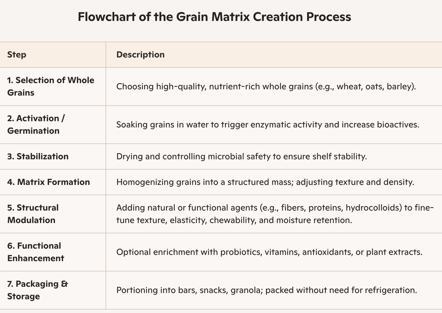 During the production of plant-based food matrices, grain substrates undergo hydration, homogenization, and mild thermal treatment. If high-temperature processing is avoided, the resulting mass retains a wide spectrum of bioactive compounds. These components contribute not only to nutritional value but also to the structural and functional integrity of the matrix — enabling applications in functional foods, nutraceuticals, and adaptive delivery formats.