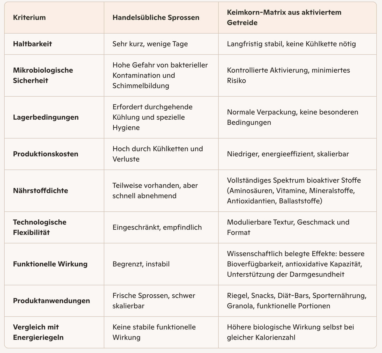 Die Keimkorn-Matrix stellt eine wissenschaftlich fundierte und technologisch stabile Plattform dar, die es Herstellern erlaubt, sich klar von konventionellen Produkten abzugrenzen. Sie überwindet die bekannten Nachteile handelsüblicher Sprossen und bietet gleichzeitig eine nachweislich höhere biologische Wirkung als herkömmliche Energie- oder Süßriegel.